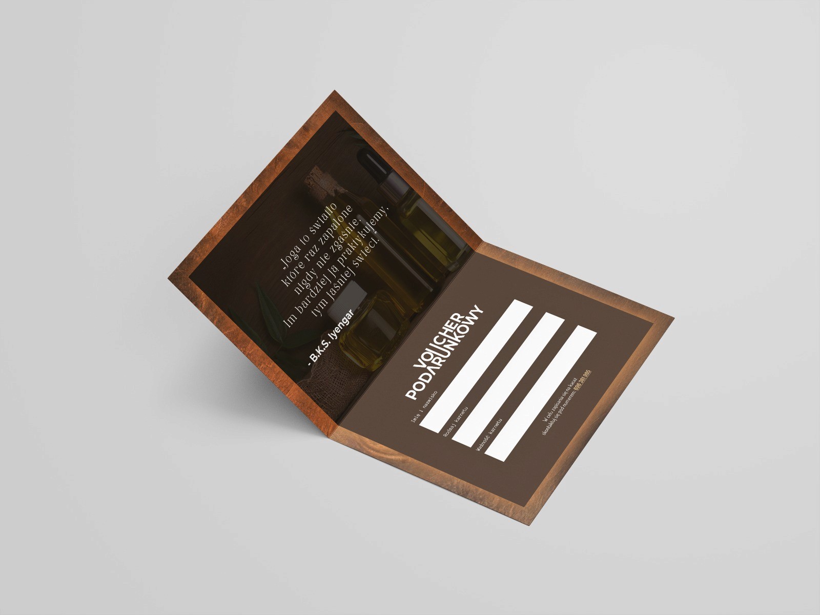 Projekt vouchera podarunkowego dla wrocławskiego studia masażu i jogi. Celem było stworzenie fizycznego nośnika, który od pierwszego kontaktu komunikuje kluczowe wartości marki: spokój, naturę i głęboką relaksację. Projekt łączy surową teksturę drewna z minimalistyczną typografią.