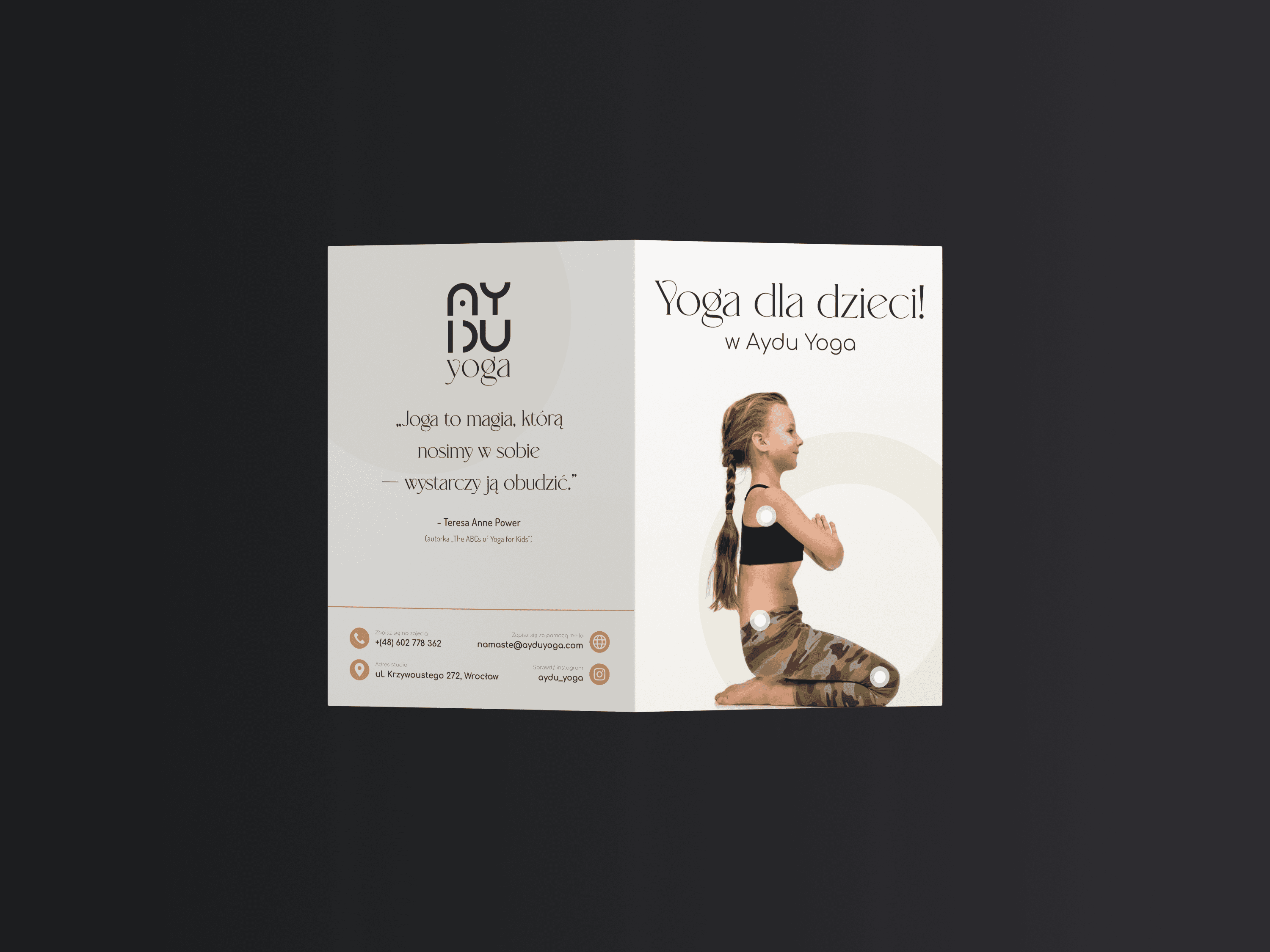 W projektowaniu materiałów drukowanych kluczowe jest to, jak projekt "czuje się" w dłoni. Zamiast standardowego, białego tła, zdecydowałem się na dominujący motyw ciemnego, szlachetnego drewna. Taki zabieg wizualny natychmiast przenosi odbiorcę w klimat gabinetu SPA, sugerując ciepło, naturę i uziemienie – elementy kluczowe dla praktyki jogi i masażu.