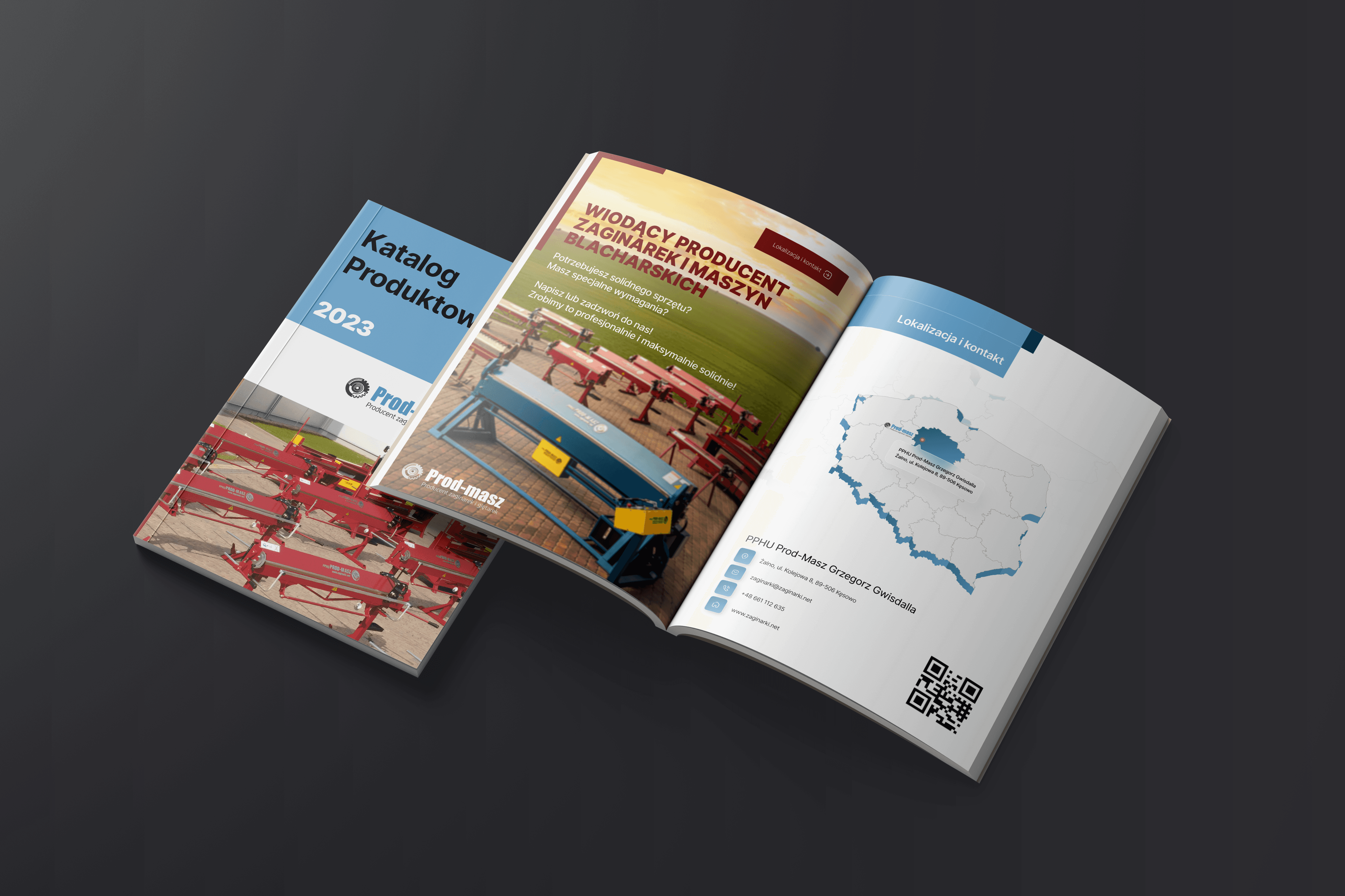 Sekcja Kontaktowa: Przejrzysta mapa Polski z zaznaczoną lokalizacją firmy i kodem QR ułatwia szybki kontakt i logistykę odbioru maszyn.