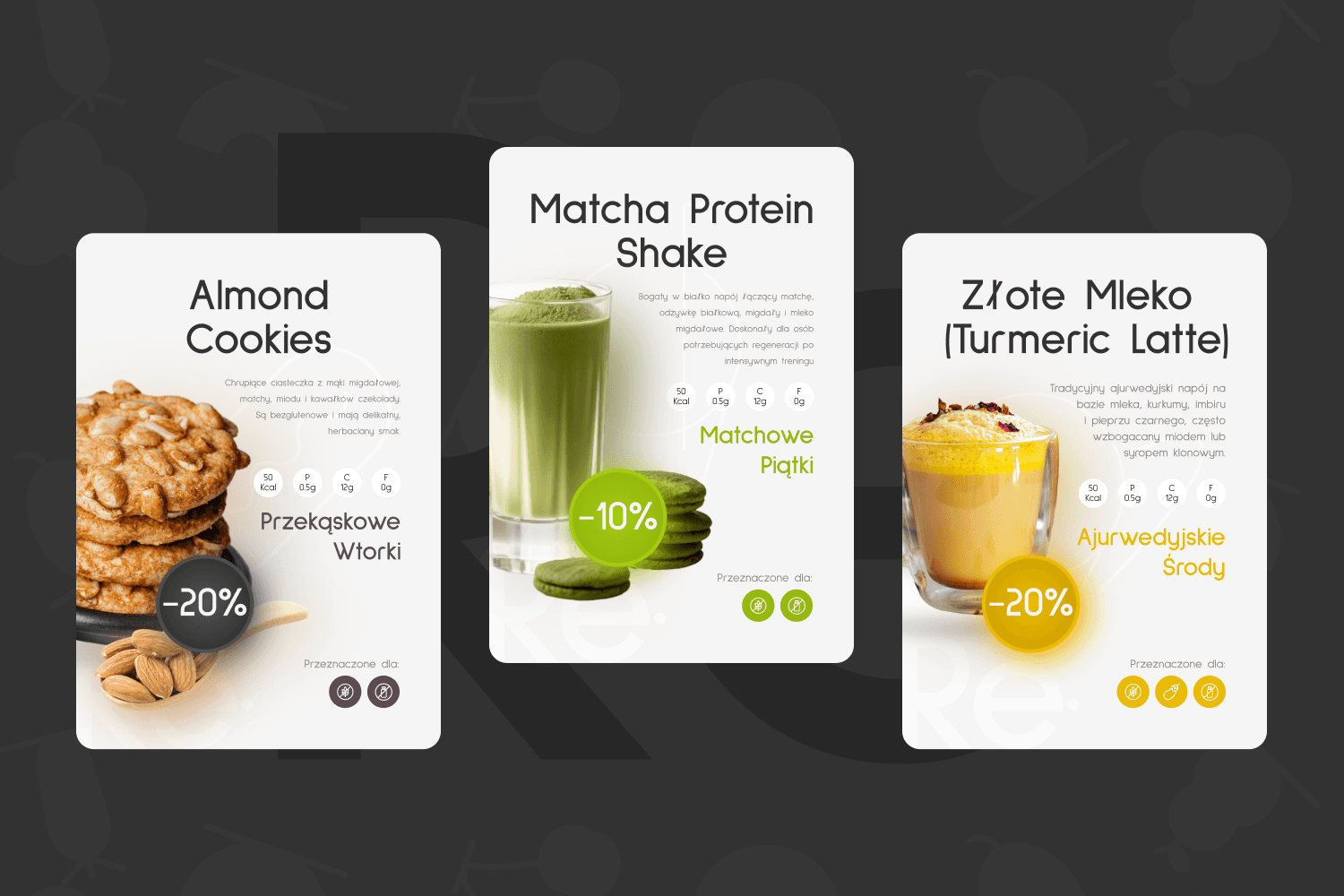 Branding dla "Re." to dowód na to, że zdrowa żywność nie musi kojarzyć się z nudą czy apteczną sterylnością. Stworzony system jest dynamiczny, popowy i bardzo "instagramowalny", co jest kluczowe dla sukcesu lokalu gastronomicznego w dzisiejszych czasach.